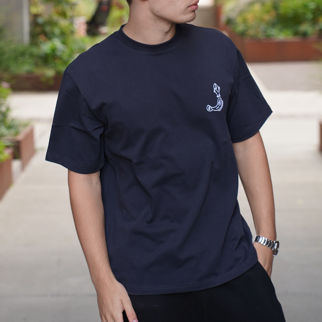 Experience luxury and style with the Jacquemus Merù Navy Blue T-Shirt. This stunning t-shirt is designed with a beautiful embroidered fisherman logo, adding texture and sophistication to any outfit. Elevate your wardrobe and make a statement with this timeless piece.
